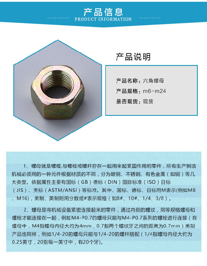 2、螺母是將機械設(shè)備緊密連接起來的零件,通過內(nèi)側(cè)的螺紋,同等規(guī)格螺母和螺栓才能連接在一起,例如M4-P0.7的螺母只能與M4-P0.7系列的螺栓進行連接(在螺母中,M4指螺母內(nèi)徑大約為4mm,0.7 指兩個螺紋牙之間的距離為0.7mm )美制產(chǎn)品也同樣,例如1/4-20的螺母只能與1/4- 20的螺桿搭配( 1/4指螺母內(nèi)徑大約為0.25英寸, 20指每一英寸中,有20個牙)。