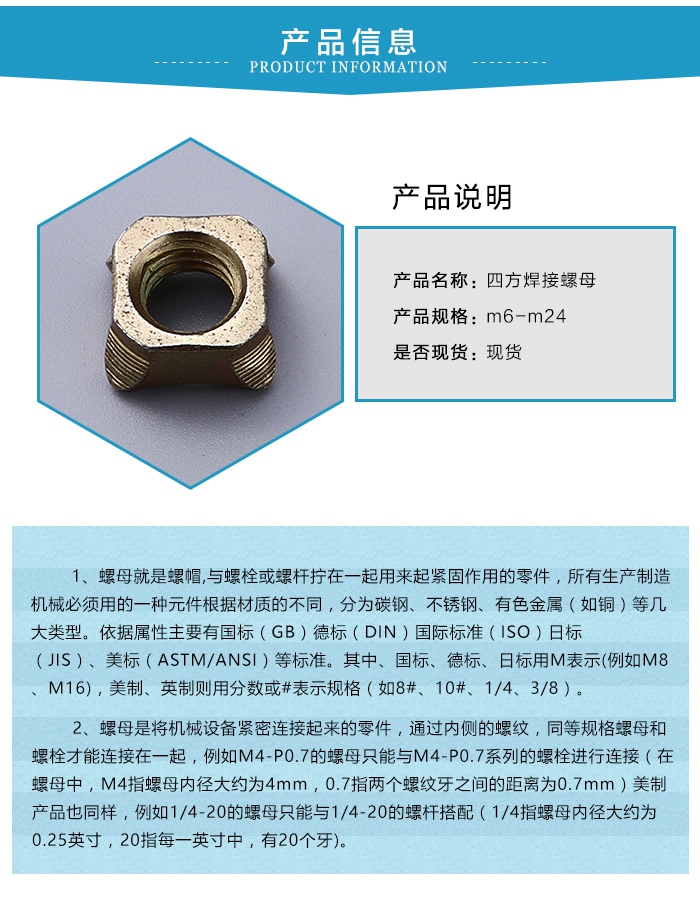 四方焊接螺母是一種在螺母外適合焊接的螺母,一般是可焊接的材料制成的而且較厚適與焊接,焊接是相當于把兩個分離件變成一個整體,用高溫將金屬融化后混合到一起再冷卻,中間會加入合金,內(nèi)部是分子力的作用,強度一般比母體強度大[1] 。焊接參數(shù)的實驗要看焊縫的熔合大小,根據(jù)熔合大小調(diào)節(jié)焊接參數(shù),直到消除缺陷。當然焊接質(zhì)量的好壞與焊前處理有關(guān),清灰、油漬等。