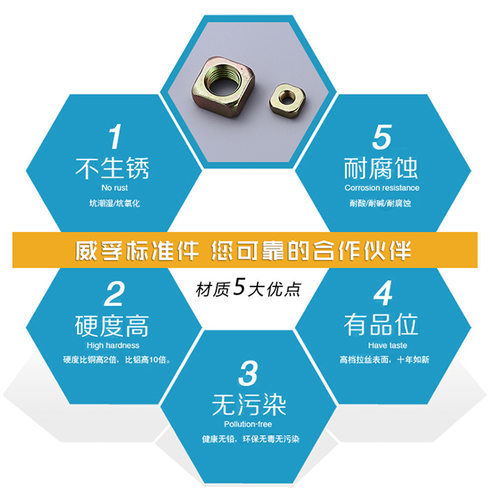 方螺母一般都是由各種金屬制作而成,我們?nèi)粘R姷降穆菽竸t主要是由鐵或者是銅制作而成,由于鐵在潮濕的地方比較愛生銹,導(dǎo)電性能也不如銅,因此銅質(zhì)的螺母經(jīng)常被用于日常生活中。銅質(zhì)的螺母不容易生銹、防腐蝕而且導(dǎo)電性能好,因此一般被人們經(jīng)常應(yīng)用于水龍頭、閥門或者是電器等防生銹、高溫導(dǎo)電等環(huán)境中使用。