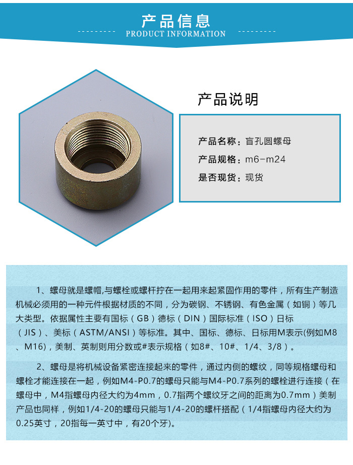 盲孔圓螺母就是螺帽,與螺栓或螺桿擰在一起用來(lái)起緊固作用的零件,所有生產(chǎn)制造機(jī)械必須用的一種原件.盲孔圓螺母的種類繁多,我們常見的有國(guó)標(biāo),英標(biāo),美標(biāo),日標(biāo)的盲孔圓螺母.盲孔圓螺母根據(jù)材質(zhì)的不同,分為碳鋼、高強(qiáng)度、不銹鋼、塑鋼等幾大類型.根據(jù)產(chǎn)品屬性對(duì)應(yīng)國(guó)家不同的標(biāo)準(zhǔn)號(hào)分為普通、非標(biāo)、(老)國(guó)標(biāo)、新國(guó)標(biāo)、美制、英制、德標(biāo)。大小不同,螺紋不等分為不同的規(guī)格. 一般國(guó)標(biāo)、德標(biāo)用M表示(例如M8、M16),美制、英制則用分?jǐn)?shù)或#表示規(guī)格(如8#、10#、1/4、3/8)。