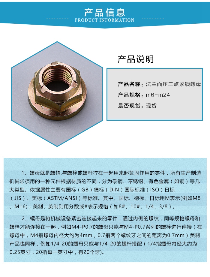 法蘭面壓三點緊鎖螺母和一般的六角螺母尺寸與螺紋規(guī)格基本相同,只不過比六角螺母相比,它是墊片和螺母是一體式的,而且在下面有防滑的齒紋,這樣增大了螺母與工件的表面積接觸,相比普通螺母加墊圈的組合,更加牢固和拉力更大。